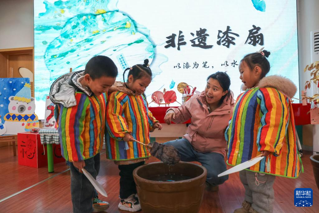 12月26日,在江蘇省揚州市江都區育才幼兒園,漆扇制作師指導小朋友制作漆扇。