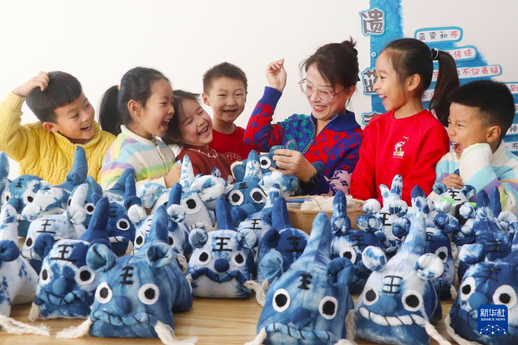 12月26日,在山東省高密市鳳鳴實驗幼兒園舉行的“學非遺 迎新年”活動中,老師利用自制的藍染布料縫制新年禮物。