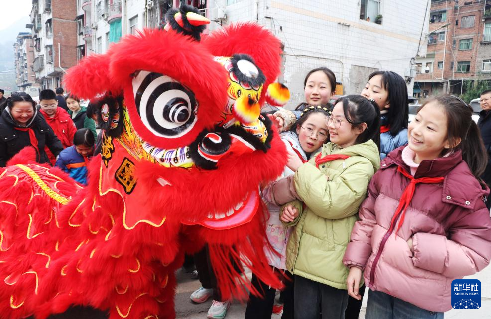 12月26日,在四川省宣漢縣黃金鎮中心校,宣漢縣黃金獅舞團為學生們表演舞獅。