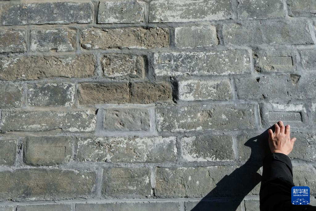 12月26日,參觀者在正陽門箭樓下參觀城磚上的銘文。