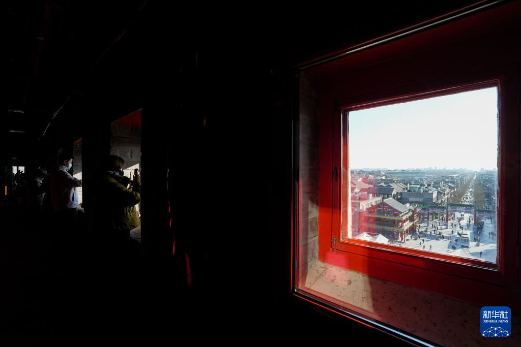 12月26日,參觀者在正陽門箭樓內拍攝前門大街的風景。