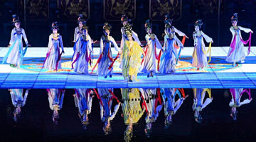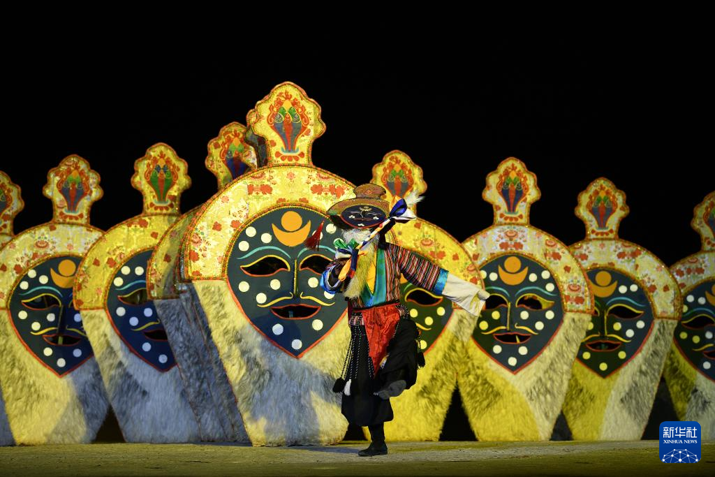 2021年4月10日,演員在大型實景劇《文成公主》中表演藏戲片段。拉薩布制面具制作技藝西藏自治區級非遺傳承人西洛創辦的拉薩市達孜區雪鄉扎西崗傳統手工藝合作社多次為該劇提供道具支持。