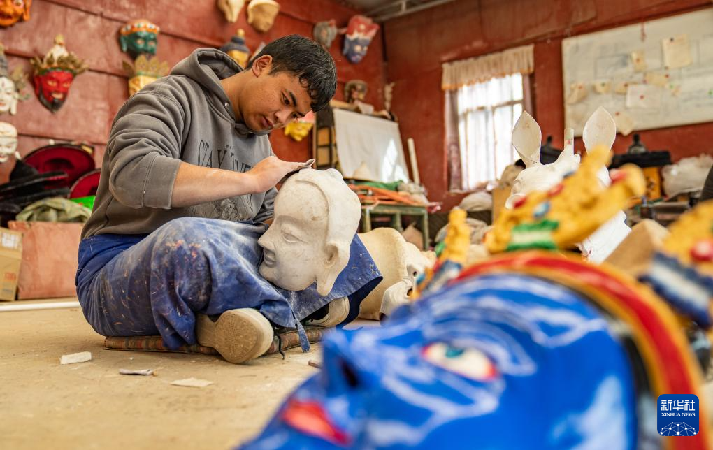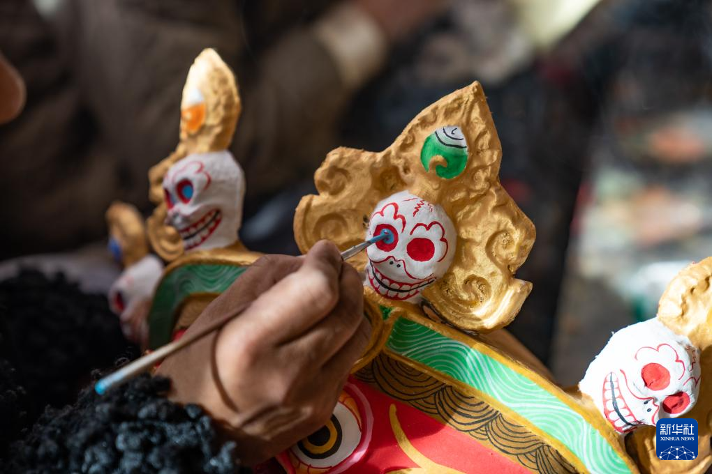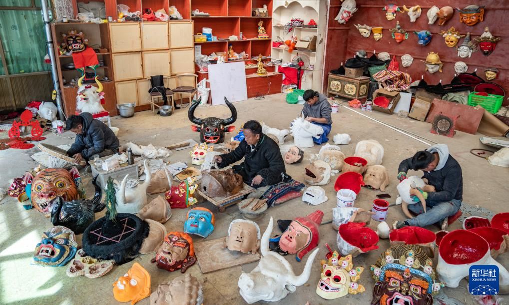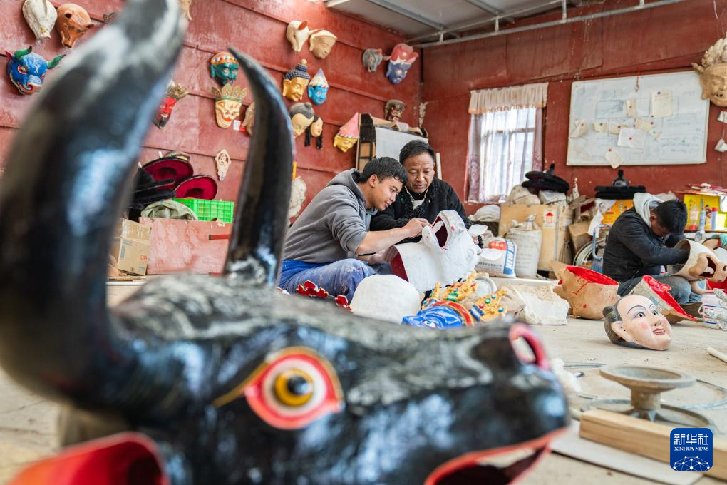 12月9日,拉薩布制面具制作技藝西藏自治區級非遺傳承人西洛(中)和同事一起制作西藏傳統面具。西洛是拉薩布制面具制作技藝的西藏自治區級非遺傳承人,他制作的面具廣泛運用于藏戲表演中。2012年,在政府的扶持下,西洛創辦了拉薩市達孜區雪鄉扎西崗傳統手工藝合作社。近年來,合作社不斷吸納當地群眾學習面具制作技藝,不僅為當地群眾提供就業機會,同時也助力非物質文化遺產的保護和發展。