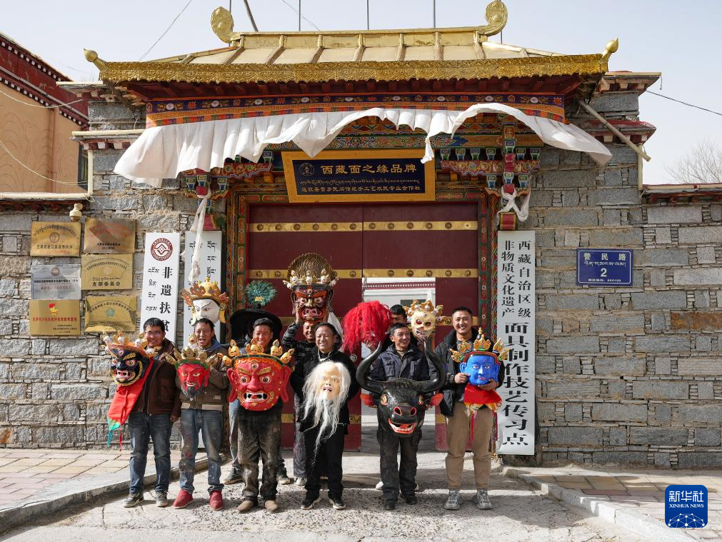 12月9日,拉薩達孜區雪鄉民間傳統手工藝農民專業合作社的面具制作工匠們在合作社門口合影。