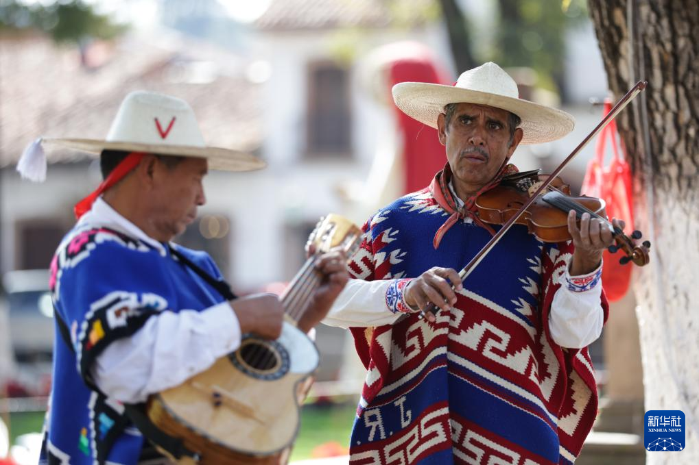 12月7日,在墨西哥米卻肯州的帕茨夸羅,藝術家演奏小提琴和吉他為“老者之舞”表演伴奏。