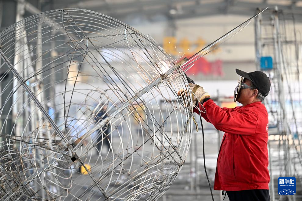 12月26日,寧夏固原市隆德縣正觀花燈工藝有限公司員工在制作花燈骨架。
