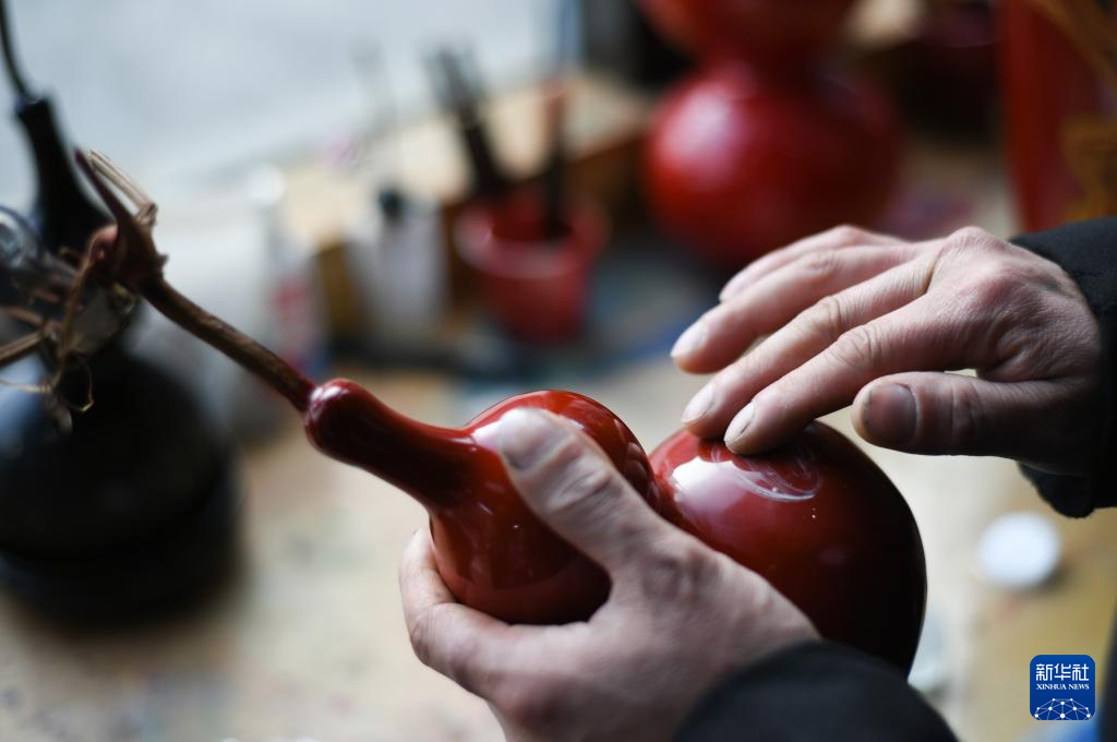 12月27日,在位于平利縣城關鎮的陜西牛王國漆非遺工坊,工人為一件漆器進行推光處理。
