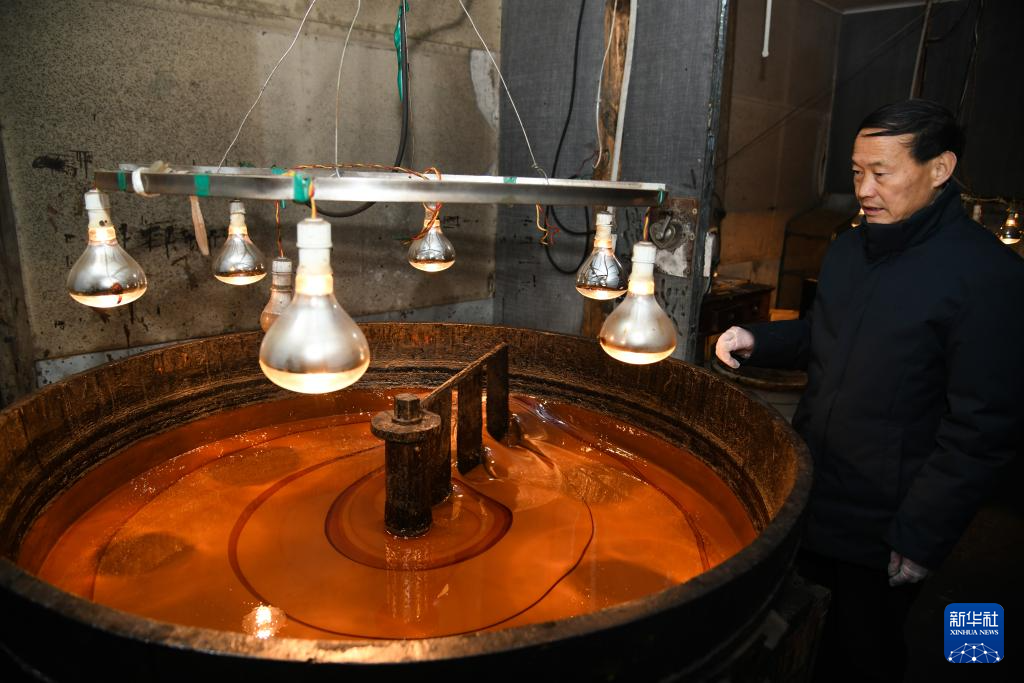 12月27日,袁輝志在位于平利縣城關鎮的陜西牛王國漆非遺工坊查看正在加工的大漆。
