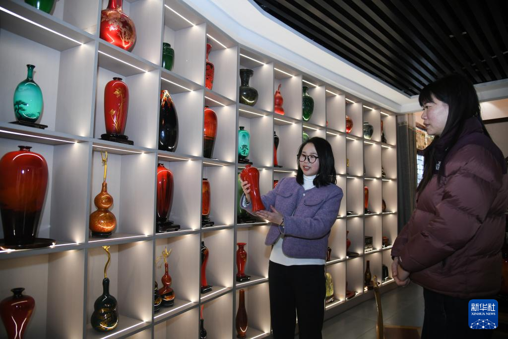 12月27日,在位于平利縣城關鎮的陜西龍頭國漆文化產業有限公司,工作人員(左)向參觀者介紹成品漆器。