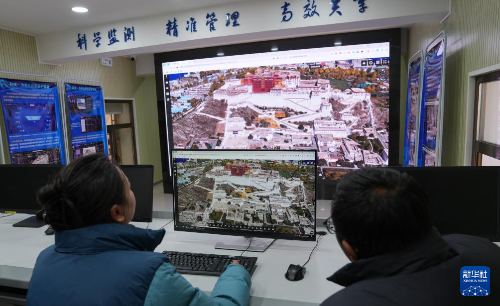 12月4日,布達拉宮監測中心的工作人員在查看無人機拍攝的圖像。