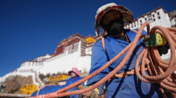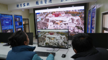 12月28日,游客在查干湖冰面上觀看冬捕(無人機照片)。
