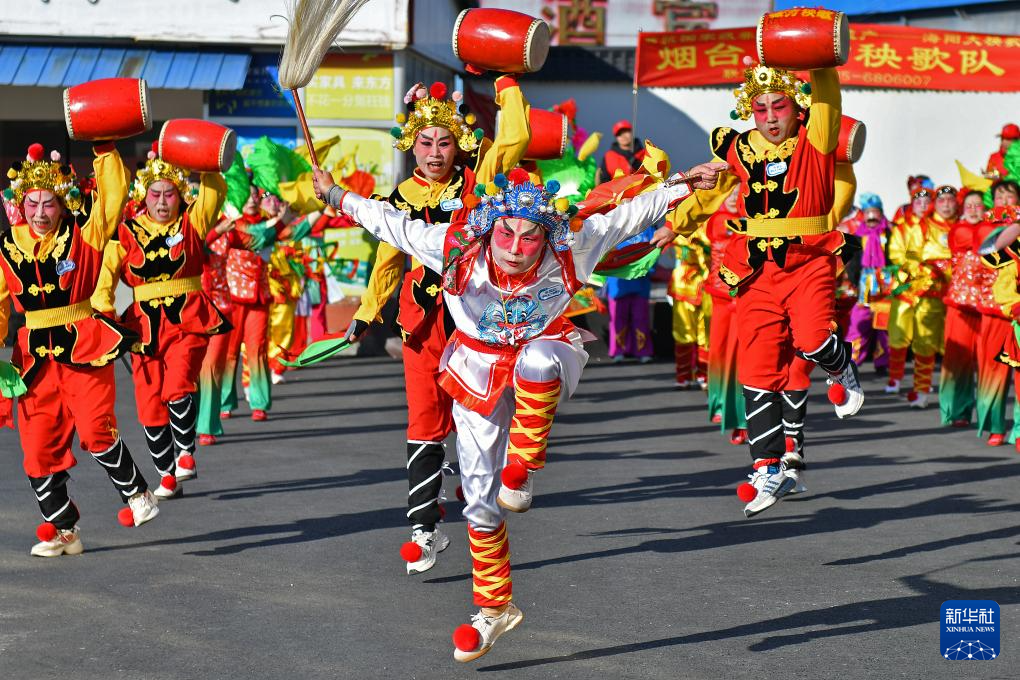12月29日,民間藝人在山東省煙臺市芝罘區東方文化市場進行民俗表演。