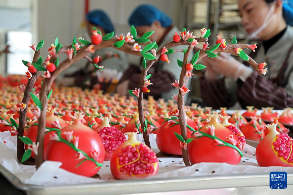 12月29日,民間藝人在山東省棗莊市“紅石榴”喜饃制作工坊捏制“紅石榴”喜饃上的裝飾物。