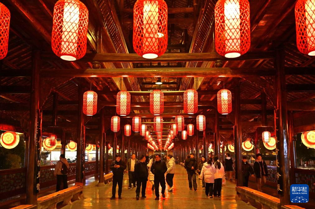 12月28日晚,湖北省宣恩縣城的風雨橋上燈籠高掛,人們觀光游覽。