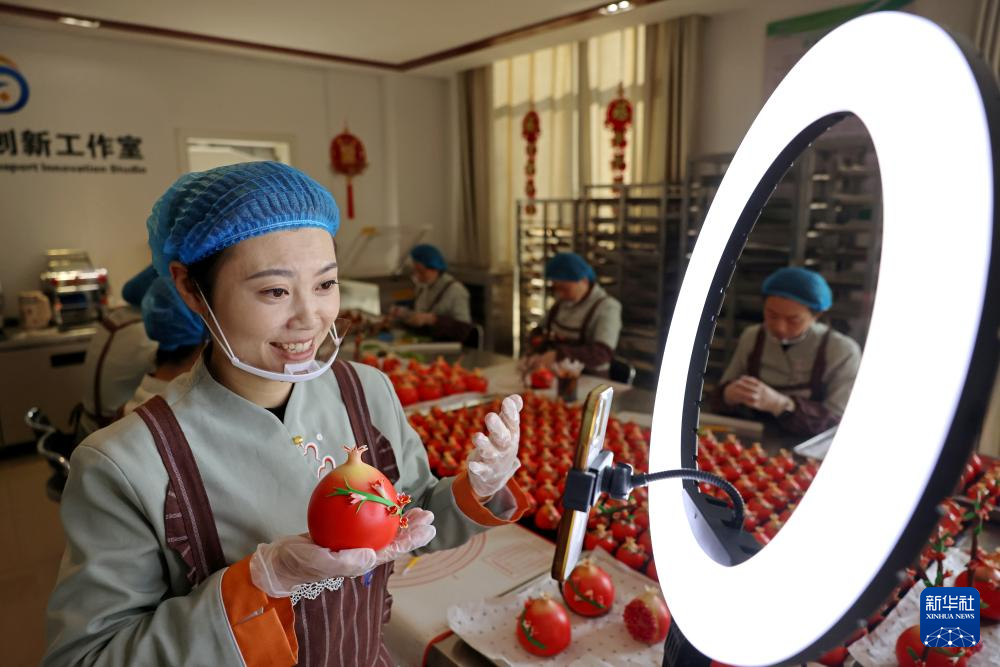 12月29日,在山東省棗莊市“紅石榴”喜饃制作工坊,民間藝人通過網絡直播介紹“紅石榴”喜饃制作方法。