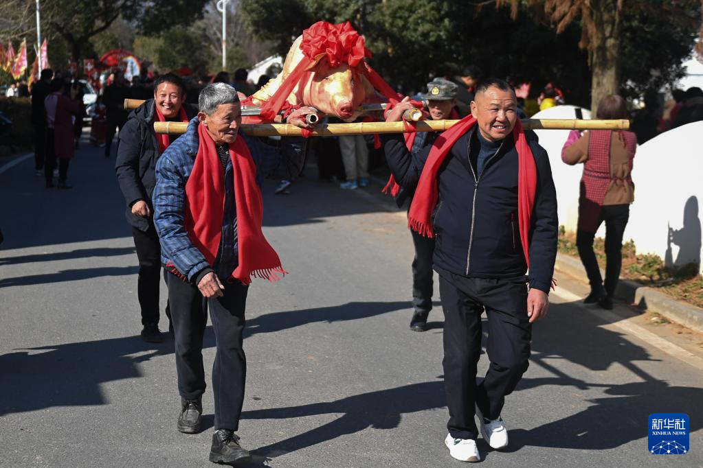 12月29日,妙西鎮龍山村村民抬著年豬在村莊巡游。