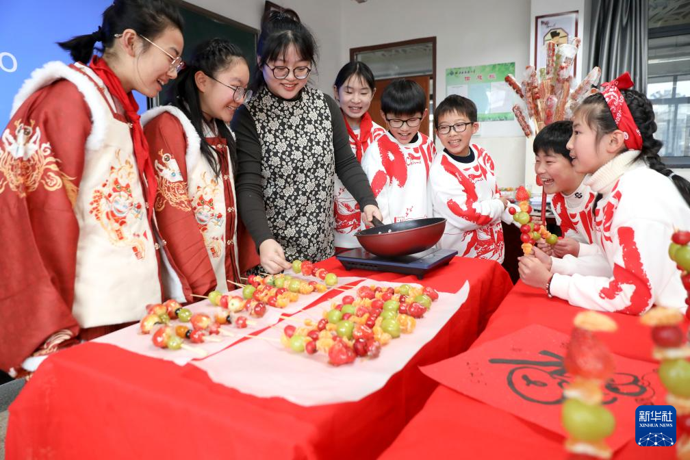 12月30日,在浙江省杭州市桐廬縣迎春小學舉行的迎新年活動中,老師在指導學生制作糖葫蘆。
