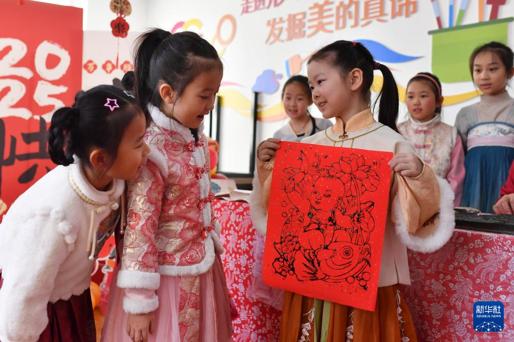 12月30日,在山東青島吉林路小學開展的“民俗文化迎新年”主題活動上,孩子們在觀看學做的非遺木版年畫。