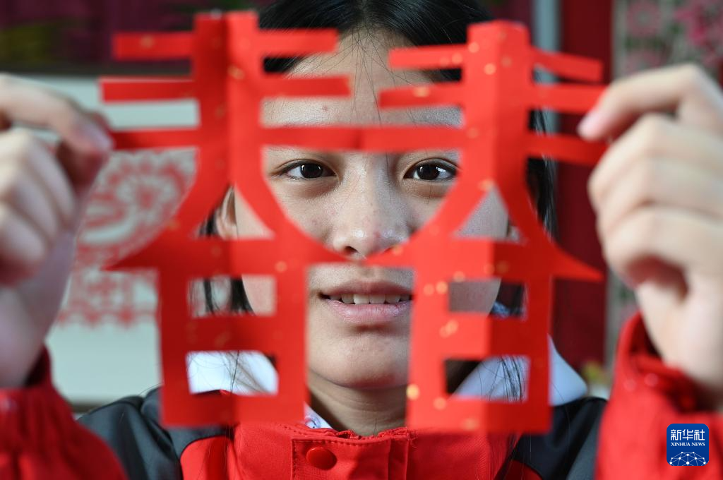 12月30日,在四川省內江市東興初級中學校,剪紙社團的成員展示迎新年剪紙作品。