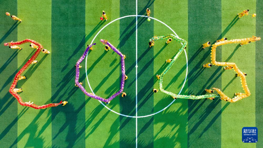12月30日,江蘇省昆山開發區實驗學校的學生在操場上舞龍迎新年(無人機照片)。