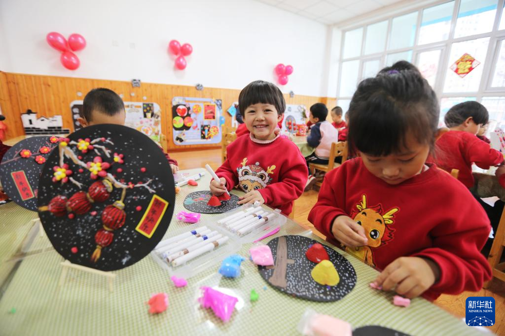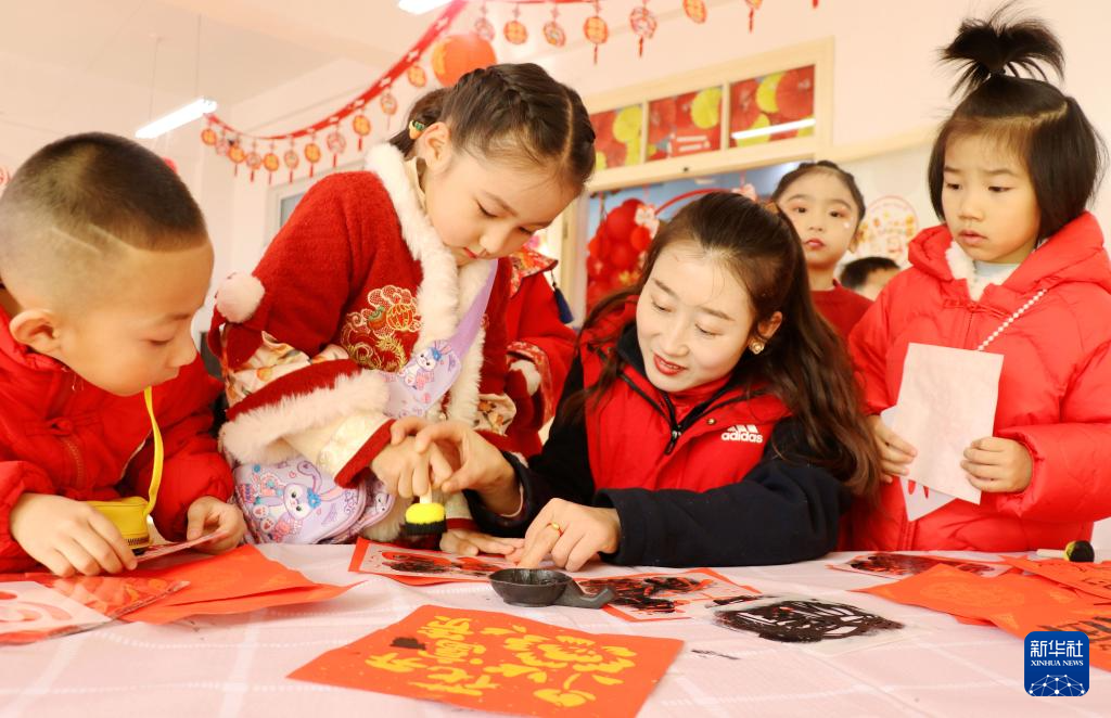 12月30日,在甘肅省平涼市靜寧縣第一幼兒園,老師在指導孩子們拓印年畫和福字。