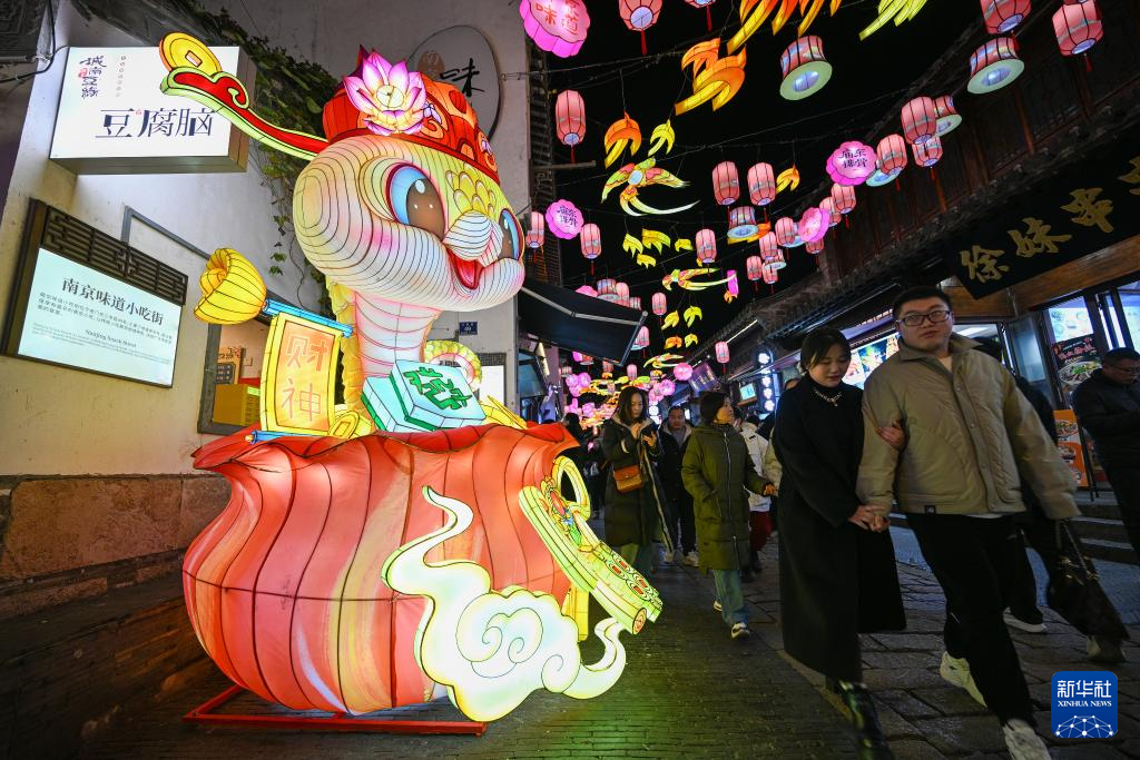 12月29日,游客在南京老門東歷史文化街區賞燈游玩。