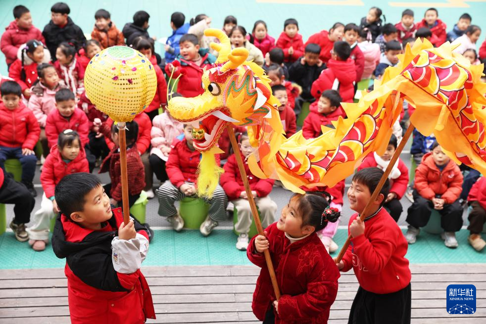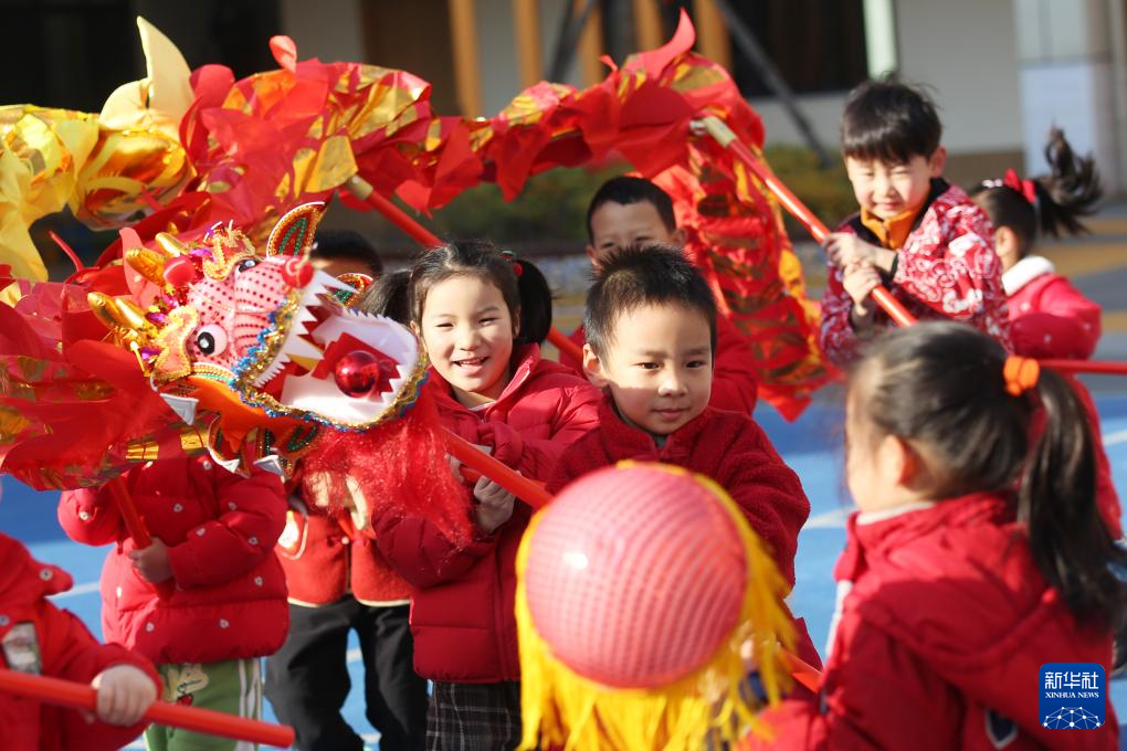 12月30日,孩子們在浙江省湖州市德清縣中心幼兒園舞龍迎新年。