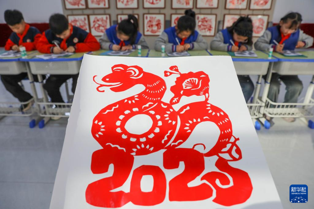 12月30日,河南省平頂山市寶豐縣山河路小學的學生在參加剪紙迎新年創作活動。