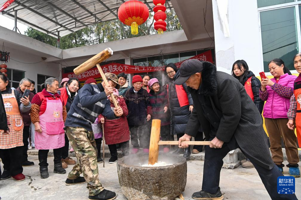 12月30日,在重慶市酉陽土家族苗族自治縣小河鎮小崗村老年食堂,青年志愿者和老人們一起打糍粑,喜迎新年。