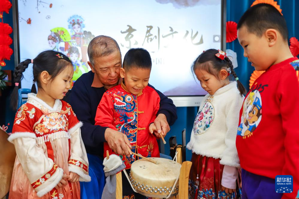 12月30日,在山東省青島市李滄區青峰路幼兒園舉行的品非遺迎新年活動中,戲曲演奏者指導小朋友體驗戲曲樂器。