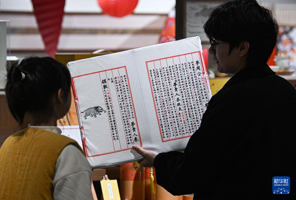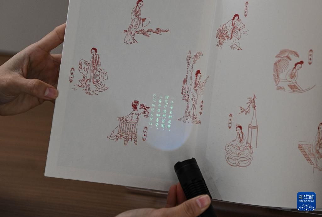 12月29日,工作人員在位于??诘纳胶\幬膭摽臻g展示《紅樓憶夢手賬》在紫光燈照射下顯現的金陵十二釵判詞。
