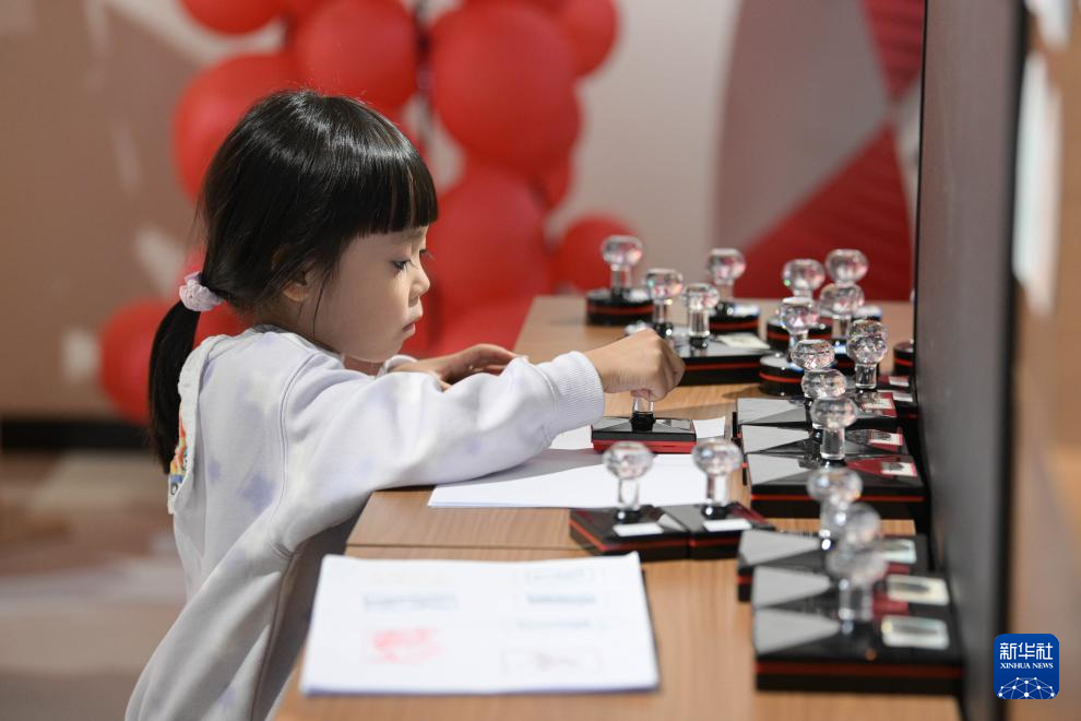 12月29日,小朋友在位于??诘纳胶\幬膭摽臻g蓋文創印章。
