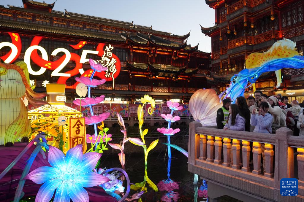 2025年1月1日,人們在豫園九曲橋上賞燈。
