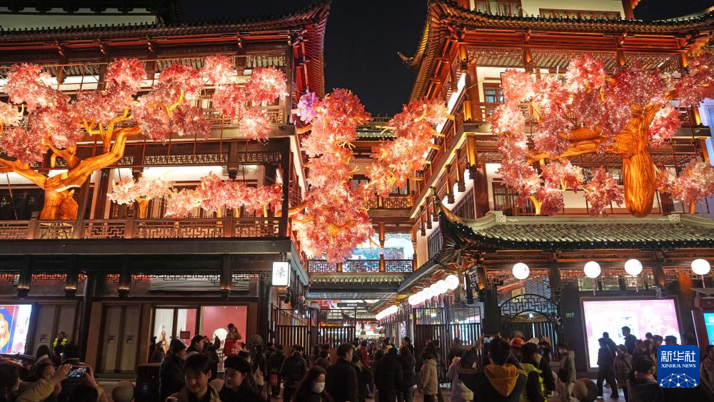 2025年1月1日,人們在豫園商城的凝暉路賞燈。