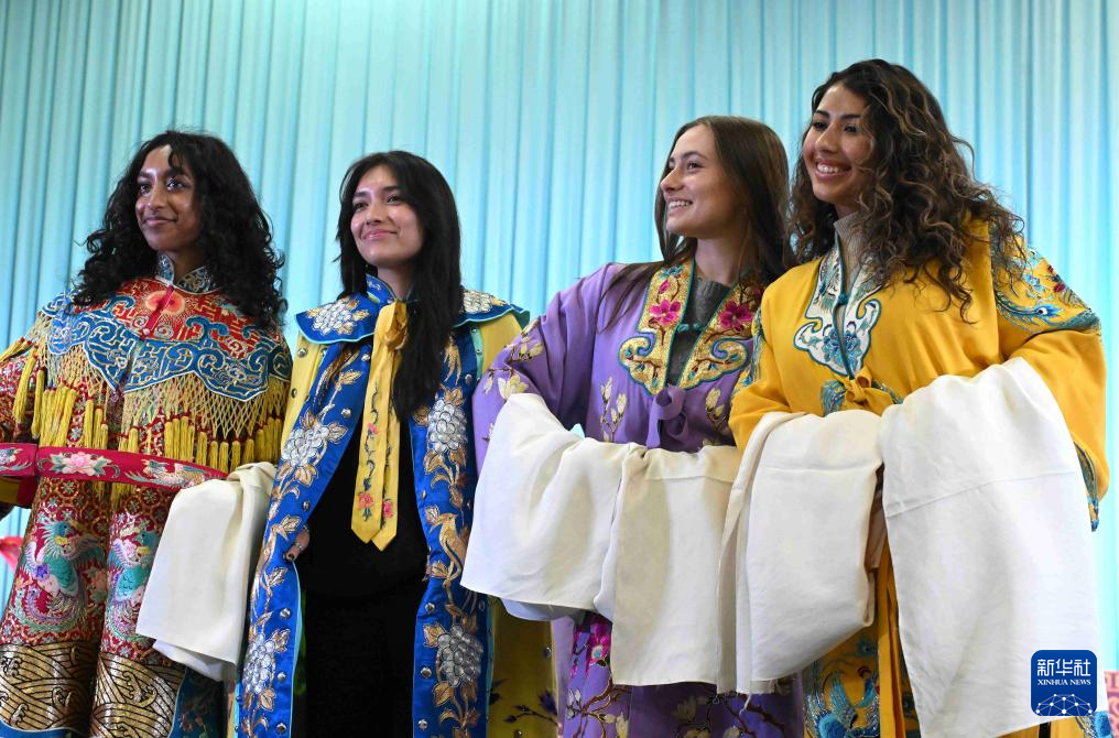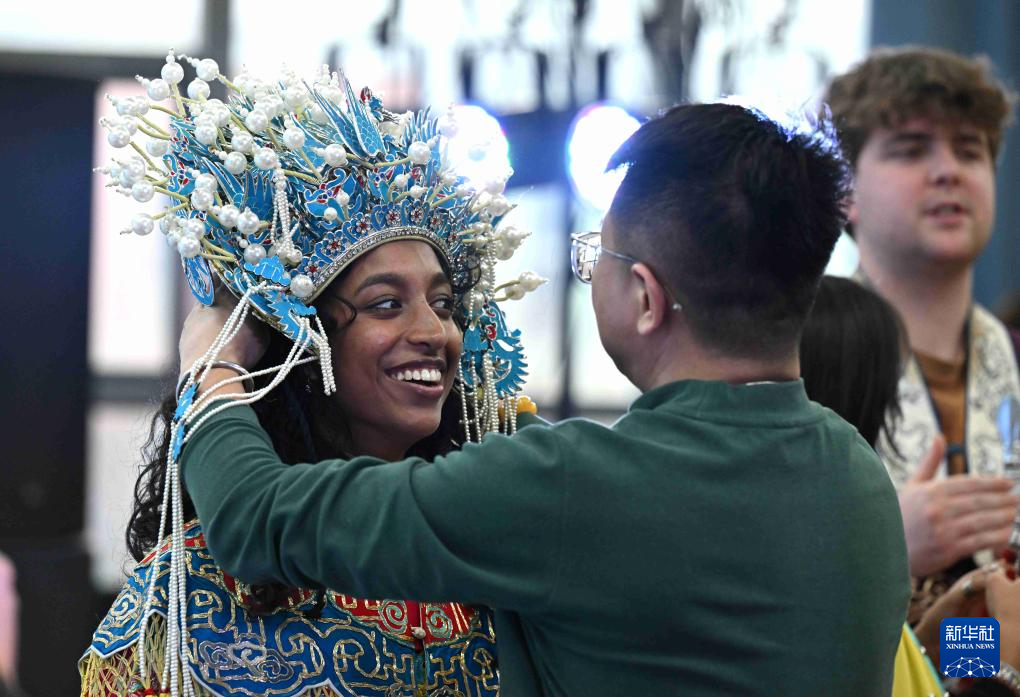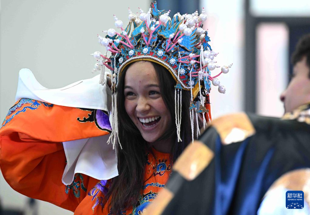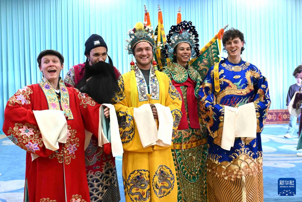 12月30日,美國大學生在河北省石家莊市京劇團體驗。
