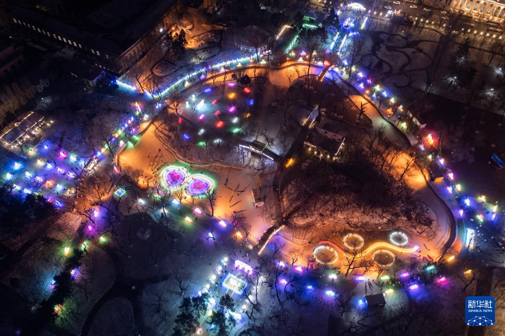 這是1月2日拍攝的位于哈爾濱市兆麟公園內的冰燈藝術游園會園區(無人機照片)。