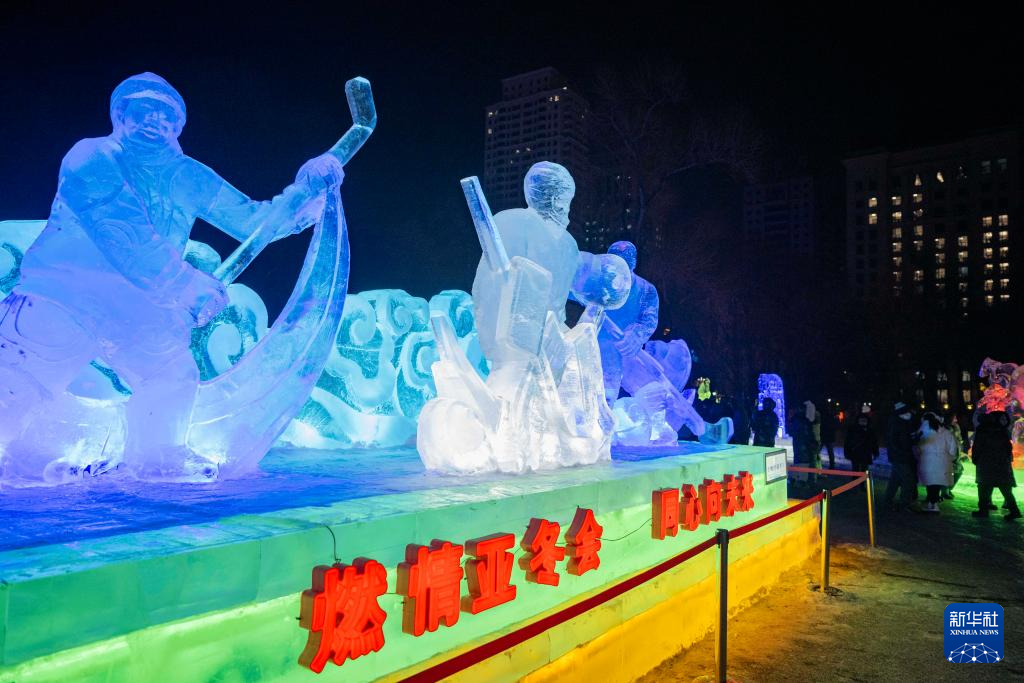 1月2日,在哈爾濱市兆麟公園,游客在冰燈藝術游園會園區內一處2025年哈爾濱亞冬會主題冰燈附近游玩。