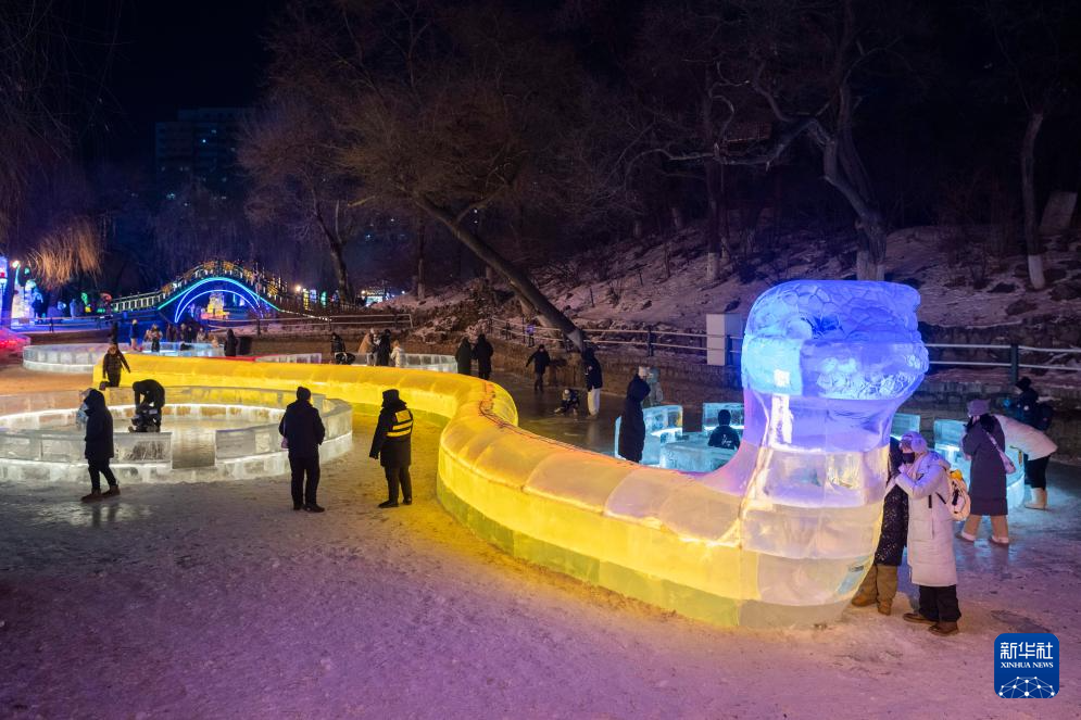 1月2日,在哈爾濱市兆麟公園,游客在冰燈藝術游園會園區內一處蛇形冰燈附近游玩。