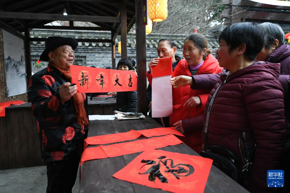 1月7日,書法愛好者在閬中古城向人們贈送春聯。