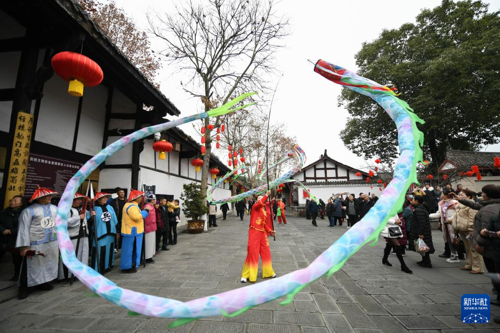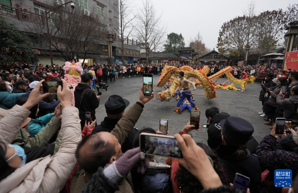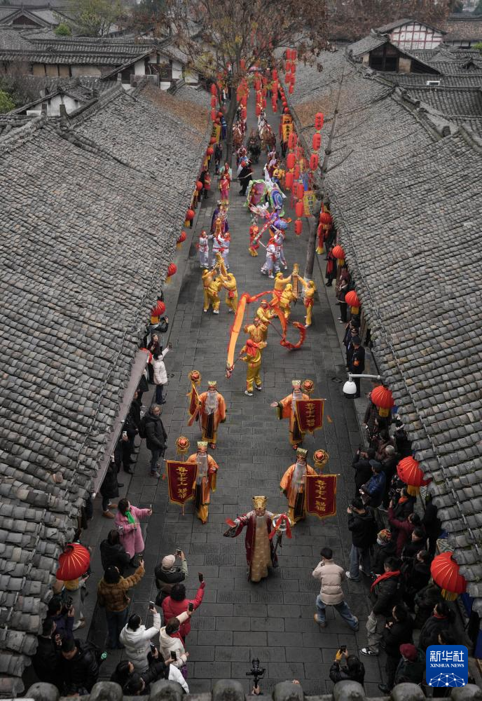 1月7日,人們在閬中古城觀看舞龍舞獅。