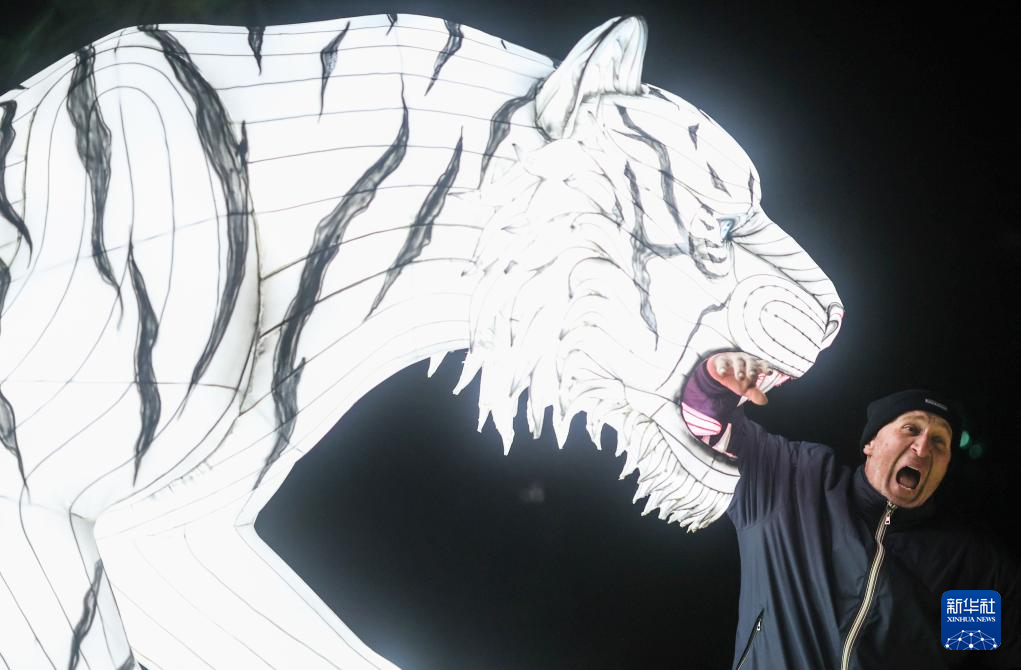 1月6日,在意大利羅馬,觀眾與白虎造型燈飾合影。