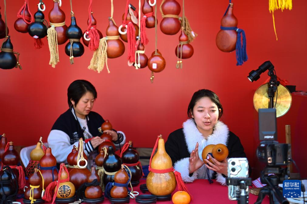 1月8日,傳統酒葫蘆工藝匠人在西安大唐芙蓉園內的非遺年貨集市上直播帶貨。