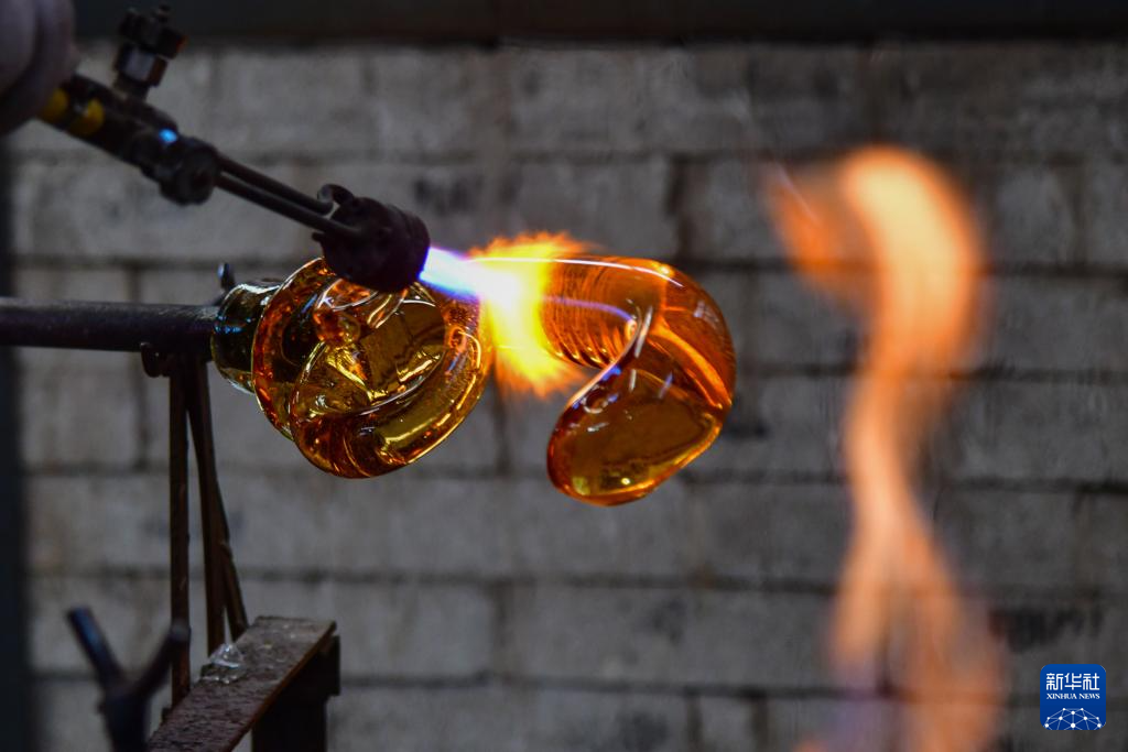 1月9日,在淄博市博山區的西冶工坊,工匠在加工琉璃工藝品。