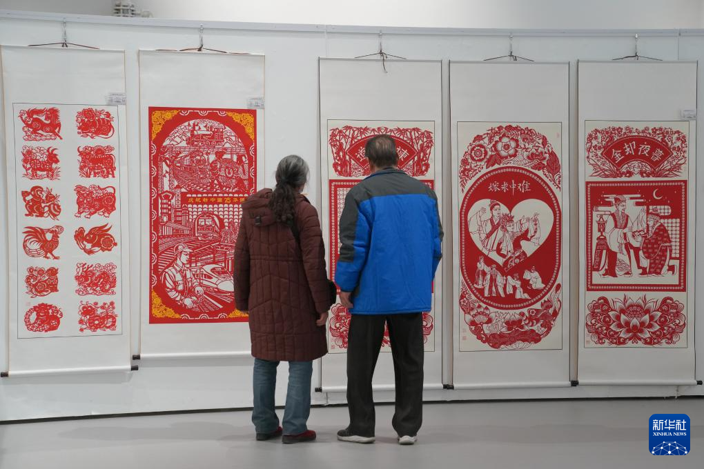 1月9日,在位于西安的陜西省文化館內,觀眾參觀來自陜西渭南的剪紙作品。