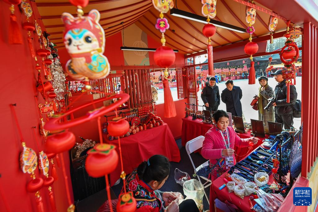 1月8日,游客在西安大唐芙蓉園內的非遺年貨集市上選購重慶酉州苗繡文創產品。