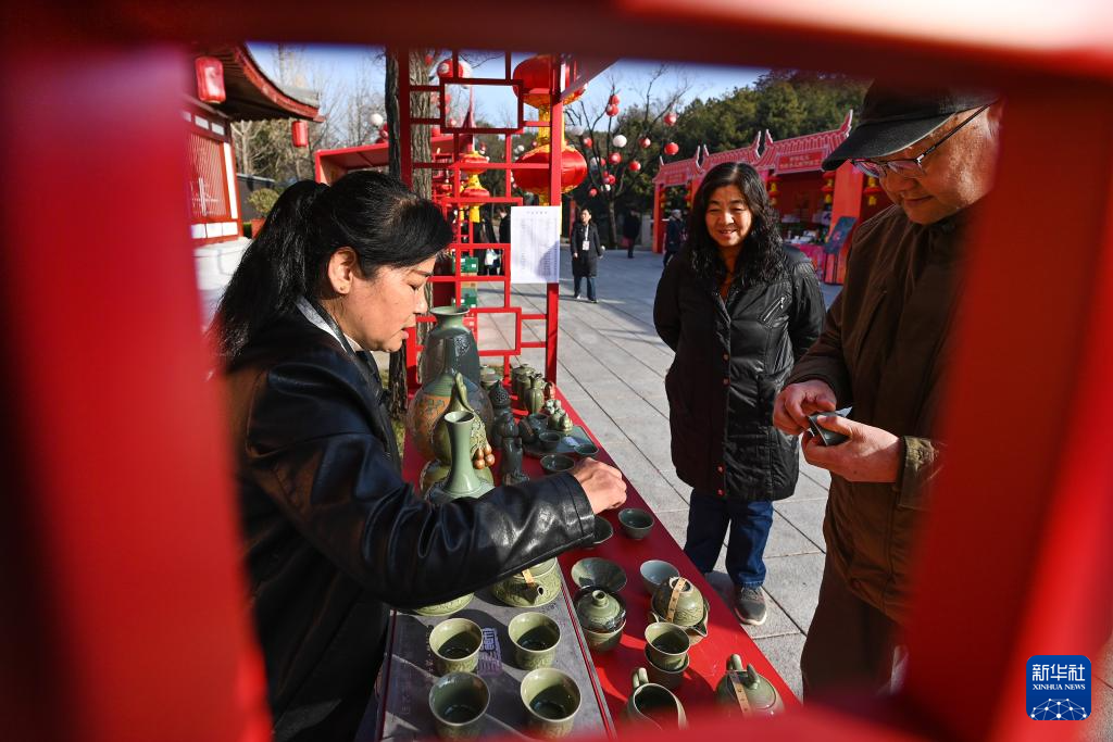 1月8日,游客在西安大唐芙蓉園內的非遺年貨集市上選購耀州瓷。