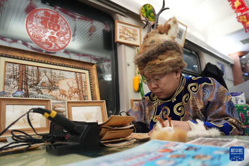 當日,在哈爾濱開往漠河的K7041次列車上,五名鄂倫春族非遺文化傳承人為旅客展示樺樹皮燙畫、面塑、刺繡等非遺項目。據了解,這是中國鐵路哈爾濱局集團有限公司開行的首趟民族非遺文化列車。隨著黑龍江省冰雪游持續火熱,中國鐵路哈爾濱局集團有限公司聯合大興安嶺地區文體廣電和旅游局,在哈爾濱至漠河方向開行民族非遺文化列車,邀請非遺傳承人現場展示傳統民族技藝,弘揚民族文化。
