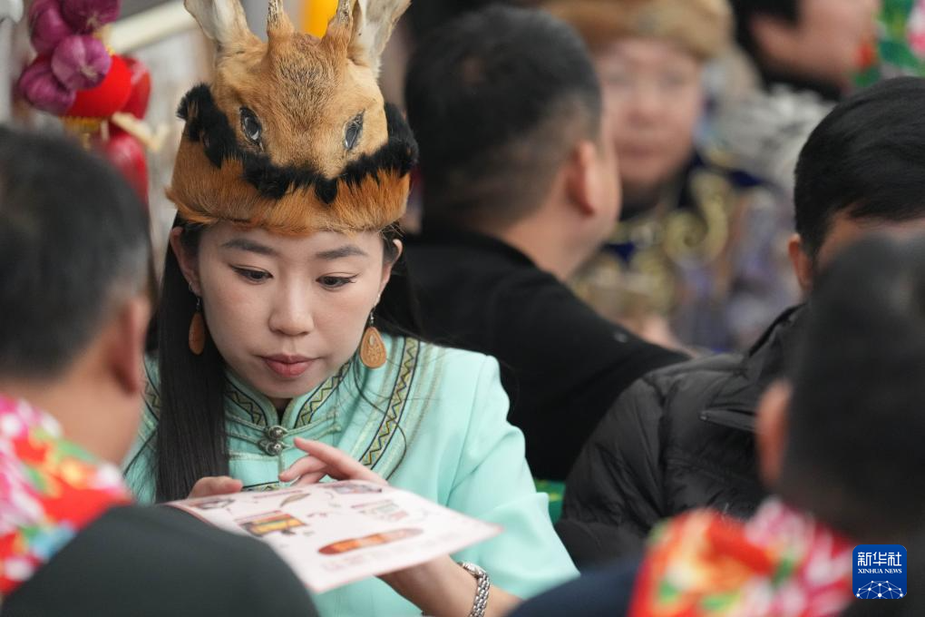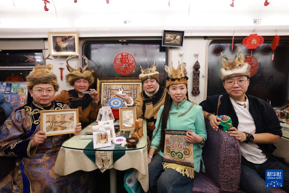 1月11日,在哈爾濱開往漠河的K7041次列車上,五名鄂倫春族非遺文化傳承人為旅客展示非遺項目。