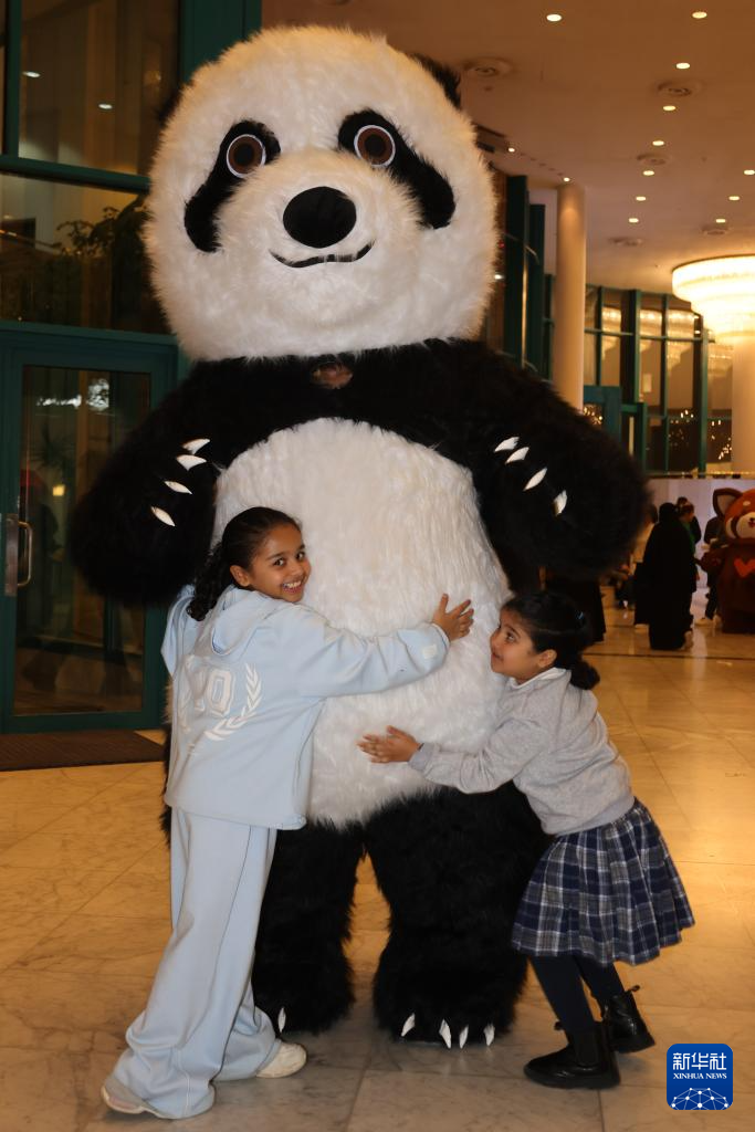 1月11日,在沙特阿拉伯首都利雅得文化宮舉行的“新春大集”活動上,孩子們與大熊貓人偶合影互動。