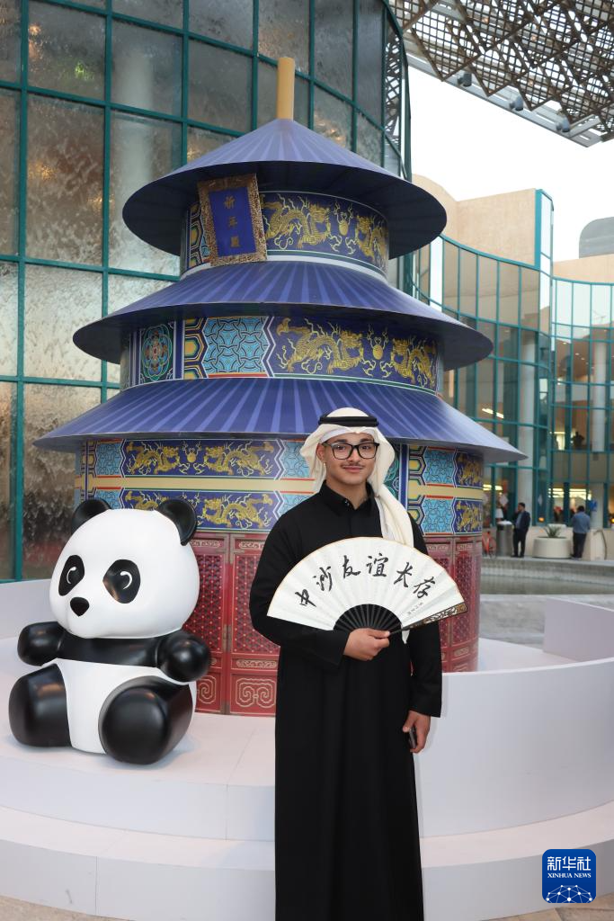 1月10日,在沙特阿拉伯首都利雅得文化宮舉行的“新春大集”活動上,一名男子在天壇模型前留影。